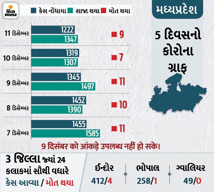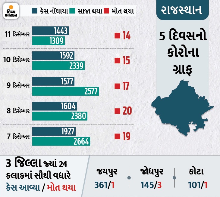 રાજ્યમાં શુક્રવારે 1222 લોકો સંક્રમિત થયા હતા. 1347 લોકો રિકવર થયા અને 9 લોકોનાં મોત થઈ ગયાં. અત્યારસુધીમાં 2 લાખ 21 હજાર 115 લોકો સંક્રમણના સકંજામાં આવી ચૂક્યા છે, જેમાં 13 હજાર 92 દર્દીની સારવાર ચાલી રહી છે, જ્યારે 2 લાખ 4 હજાર 641 લોકો સાજા થઈ ચૂક્યા છે. સંક્રમણથી જીવ ગુમાવનારાની સંખ્યા હવે 3382 થઈ ગઈ છે.