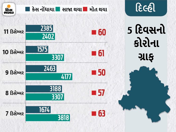 રાજધાની દિલ્હીમાં છેલ્લા 24 કલાકની અંદર 2385 લોકો કોરોના પોઝિટિવ થયા છે. 2402 લોકો રિકવર થયા અને 60 લોકોનાં મોત થયાં છે. અત્યારસુધીમાં 6 લાખ 3 હજાર 535 લોકો સંક્રમિત થઈ ચૂક્યા છે, જેમાં 18 હજાર 676 દર્દીની સારવાર ચાલી રહી છે, જ્યારે 5 લાખ 74 હજાર 925 લોકો સાજા થઈ ચૂક્યા છે. સંક્રમણથી જીવ ગુમાવનારાની સંખ્યા હવે 9934 થઈ ગઈ છે.