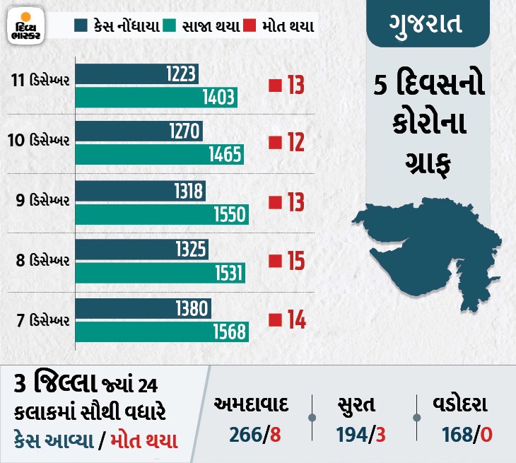 છેલ્લા 24 કલાકમાં રાજ્યમાં 1223 લોકો કોરોના સંક્રમિત થયા છે. 1403 લોકો રિકવર થયા અને 13 લોકોનાં મોત થયાં. અત્યારસુધીમાં 2 લાખ 25 હજાર 304 લોકો સંક્રમિત થઈ ચૂક્યા છે, જેમાં 13 હજાર 527 દર્દીની સારવાર ચાલી રહી છે, જ્યારે 2 લાખ 7 હજાર 629 લોકો સાજા થઈ ચૂક્યા છે. સંક્રમણથી જીવ ગુમાવનારાની સંખ્યા હવે 4148 થઈ ગઈ છે.