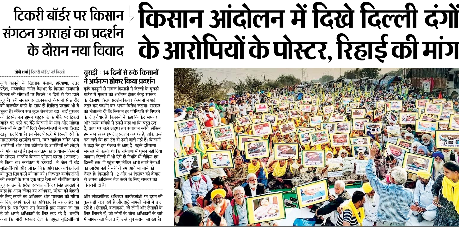 ટિકરી બોર્ડરના ભાસ્કર રિપોર્ટર તોશી શર્માએ અહેવાલ આપ્યો હતો કે ગુરુવારે ધરણા પર બેઠેલા ખેડુતોના મંચ ઉપર અને મહિલા ખેડૂતોના હાથમાં બેનર-પોસ્ટરો જોવા મળ્યા હતા. આમાં, દિલ્હી રમખાણોનો માસ્ટર માઈન્ડ શરજિલ ઇમામ, ઉમર ખાલિદ અને અન્ય આરોપી અને ભીમા કોરેગાંવના આરોપીને મુક્ત કરવાની માંગ કરવામાં આવી હતી. આંતરરાષ્ટ્રીય માનવ અધિકાર દિવસ નિમિત્તે ટિકરીસરહદ પર એક અલગ આયોજન થયું હતું. આ કાર્યક્રમ ખેડૂત સંગઠન ભારતીય કિસાન સંઘ એકતા (ઉગરાહા) દ્વારા યોજવામાં આવ્યો હતો. આમાં જેલમાં રહેલા બુદ્ધુજીવીઓ અને લોકશાહી અધિકાર કાર્યકરોને તાત્કાલિક મુક્ત કરવામાં આવે તેવી માંગ કરવામાં આવી હતી.